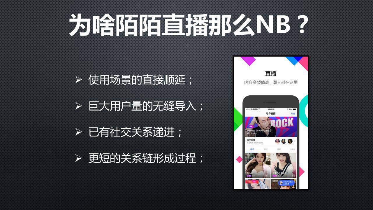 之前有媒体写过一篇文章说直播火了,赚到真金白银的是三家上市公司:陌陌、YY和9158。我部分同意这个观点,因为陌陌确实吃到了这个红利;而YY本应该吃到最多,但是吃的不是很好;9158本身就是这个样子。