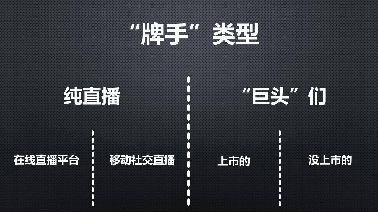 我分为两类,第一类是纯直播类的公司,公司就是做直播的,没有其他的业务。这一类还可以细化成两类,在线直播平台和移动社交直播。另一类就是反过来,有一些业务,并且做的很大,同时大量的直播业务做的也不错,这些巨头们我可以按上市和没上市划分。