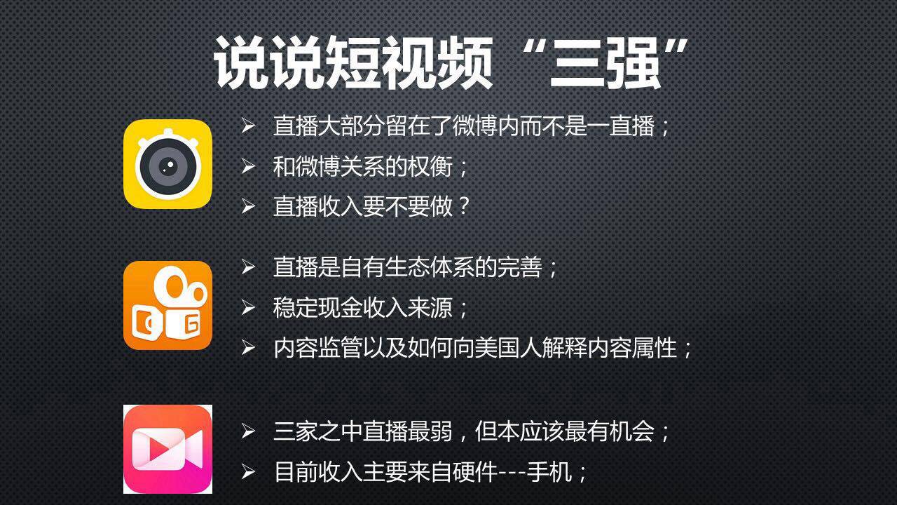 目前看陌陌,第一就要看陌陌是不是把所有用户都已经导进来了,现在看没有。第二陌陌是否已经开始强调更高的ARPU值,也就是洗用户,目前看也没有。所以早未来一年之内,陌陌直播收入降低不可能,但是再远就不知道。
