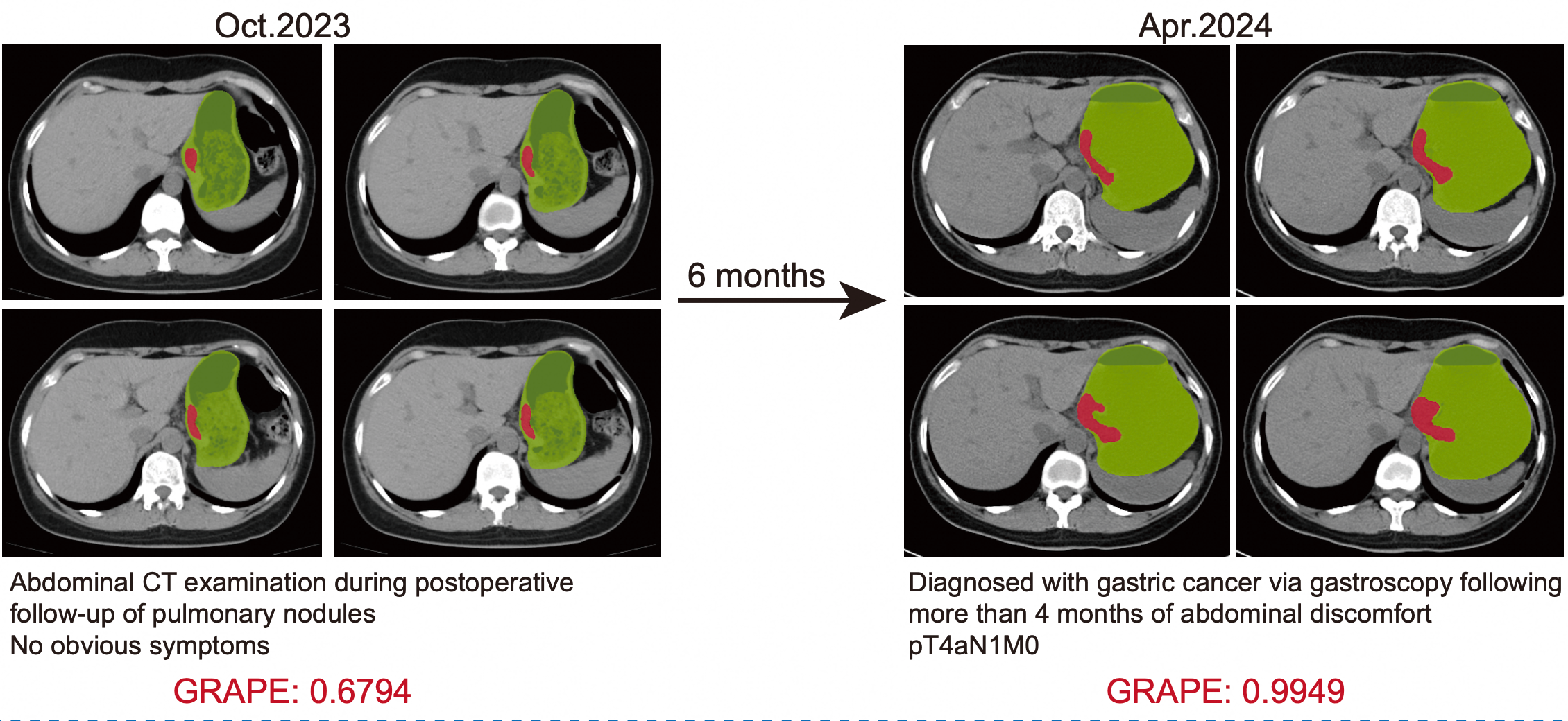 论文第一作者、浙江省肿瘤医院胃外科博士胡灿介绍,DAMO GRAPE模型有望填补在影像检查中机会性发现早期胃癌的空白。本次研究中,团队对11名患者确诊胃癌前的CT影像进行回顾性分析,发现AI模型可提前2到10个月发现胃癌。例如,其中1名45岁患者因腹部不适接受胃镜检查,确诊局部晚期胃癌,而该患者6个月前因其他疾病做过胸腹部平扫CT检查,当时未报告腹部病变。胡灿将这张旧片子导入AI模型,提示存在胃癌病灶。也就是说,如果6个月前就有AI自动筛查,这名患者将有机会更早确诊并接受治疗。