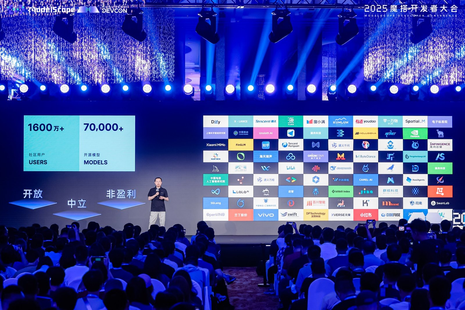 魔搭社区是一个开放、中立、非盈利的组织。本次开发者大会由国家信息中心指导、魔搭社区主办。大会覆盖前沿模型与工具、MCP和Agent、科研智能等七大论坛和65个主题。国内外知名AI开源模型团队均现场参会分享,包括谷歌、英伟达、英特尔、Midjourney、DeepSeek、字节跳动、腾讯、蚂蚁、MiniMax、智谱、阶跃星辰、群核科技等头部企业,以及中科院、上海人工智能实验室、之江实验室等知名科研机构。全球200余位AI领域专家学者和数万名开发者齐聚一堂,迎来大模型全明星盛会。