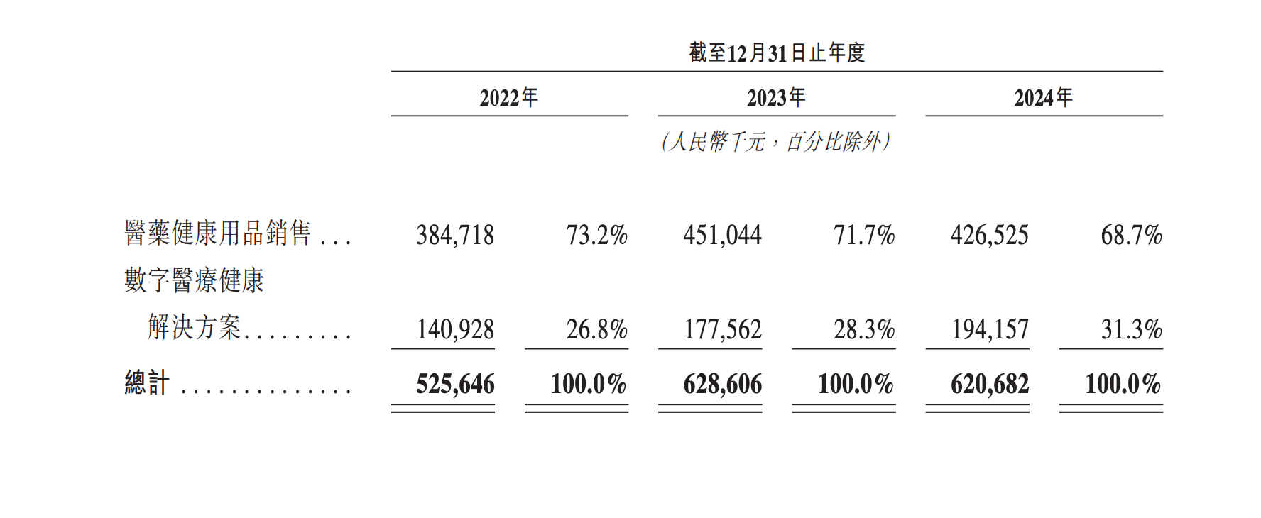 2022年、2023年及2024年,医药健康用品销售所产生的收入分别占公司总收入的73.2%、71.7%及68.7%,其中,于相同年度内医药健康用品批发产生的收入分别占总收入的57.8%、66.1%及64.9%。同期,数字医疗健康解决方案所得收入分别占总收入的26.8%、28.3%及31.3%。