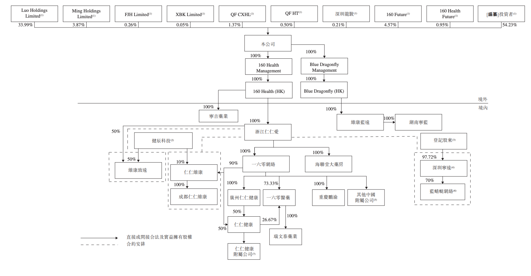 招股书显示,健康160在上市前的股东架构中,罗宁政通过Luo Holdings Limited持股33.99%,为控股股东,其也可行使Ming Holdings Limited附带的表决权3.87%。此外,160 Future持股4.57%,QF CXHL持股为1.37%,QF HT持股为0.5%,FJH Limited持股为0.26%,深圳龙骏持股为0.21%。