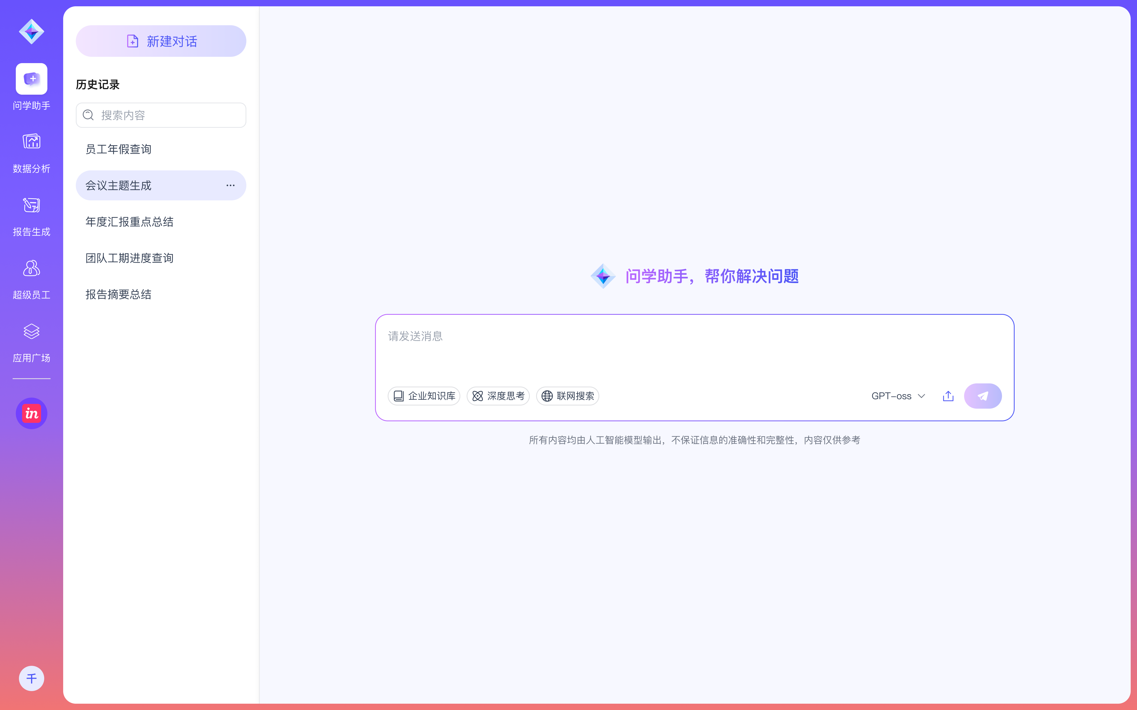 问学助手以极简的交互、统一的界面,重新定义员工使用AI的方式。用户无需在不同系统间反复切换,也无需经历冗长的学习过程,即可快速调用各类AI能力。这种“开箱即用”的体验,极大地降低了AI使用门槛,让智能工具成为员工触手可得的助手。