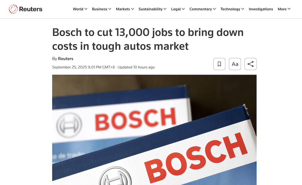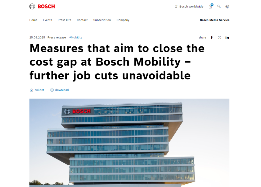 其实早在 9 月初,博世就已释放 “预警信号”,当时博世透露,核心的移动出行部门已陷入25 亿欧元(约合 29.5 亿美元)的成本缺口。