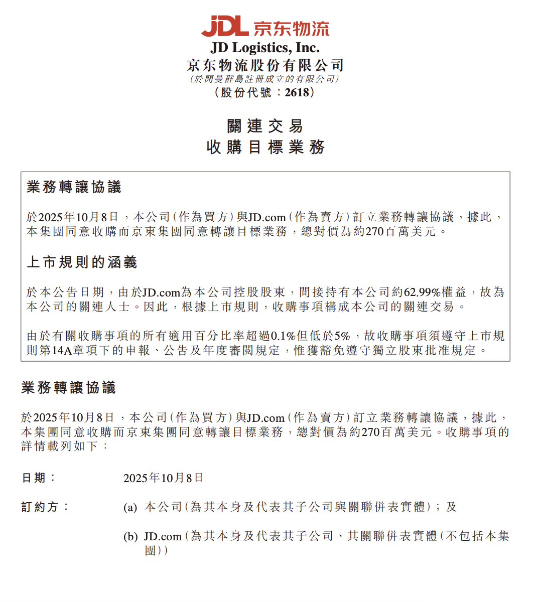 10月9日,京东物流在港交所公告,该公司(作为买方)与JD.com(作为卖方)订立业务转让协议,据此,该集团同意收购而京东集团同意转让目标业务,总对价为约2.7亿美元。