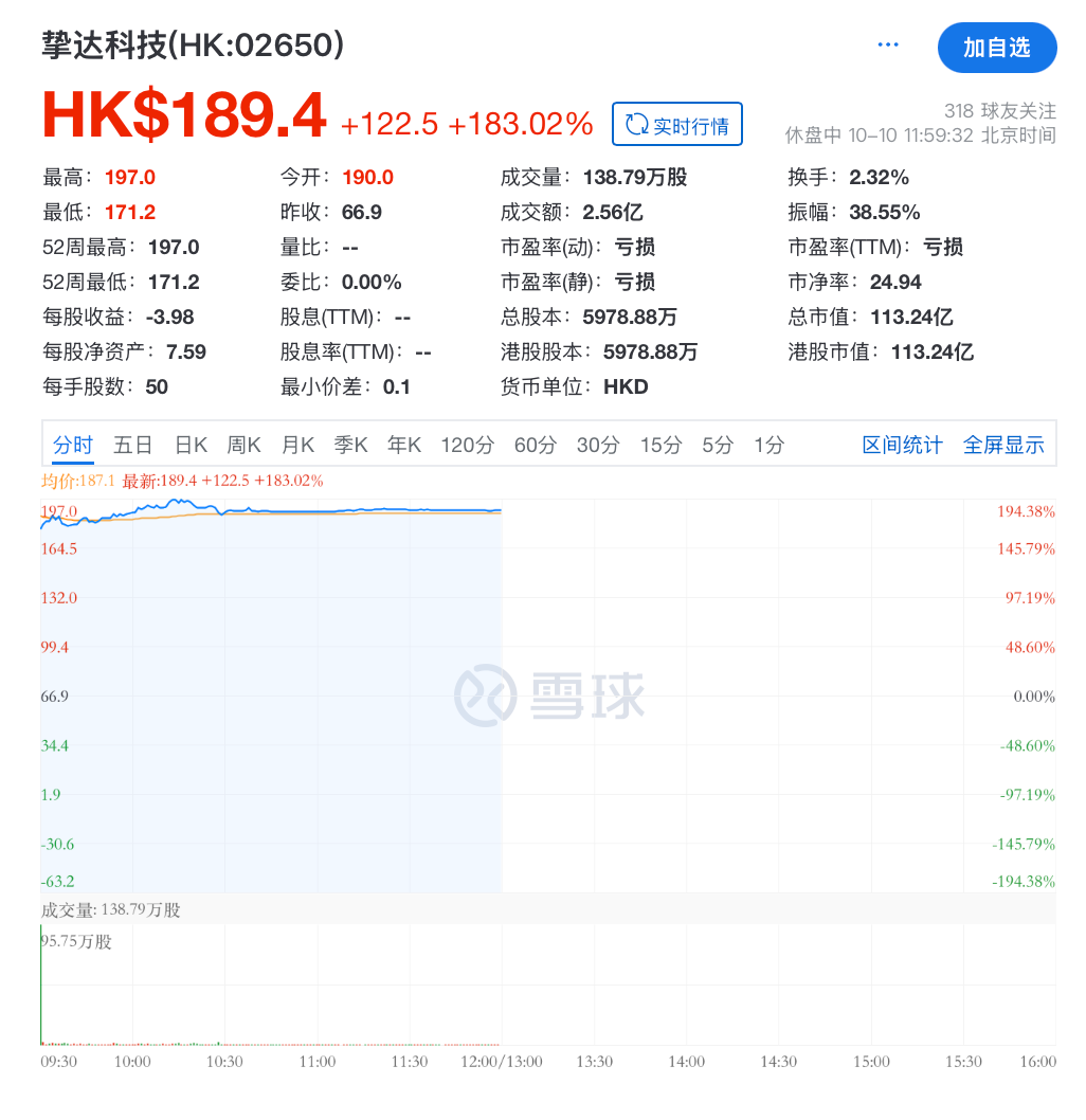 今日开盘,挚达科技较发行价66.92港元大涨183.92%,报190.0港元/股,市值113.60亿港元。截至午间休市,挚达科技涨183.02%报189.4港元/股,总市值113.24亿港元。