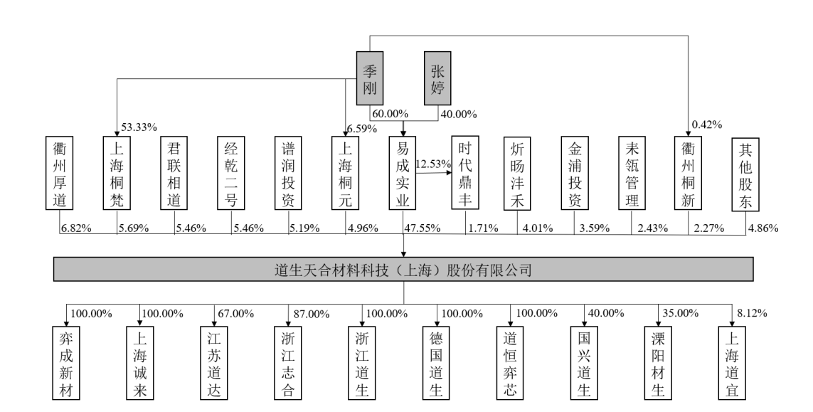 股权结构上,在上市前,公司实际控制人季刚、张婷夫妇通过易成实业持有公司47.55%股份,季刚通过担任上海桐梵、上海桐元、衢州桐新执行事务合伙人分别控制公司 5.69%、4.96%、2.27%表决权,合计控制公司 60.47%的表决权。因此实控人夫妇将半数以上分红收入囊中。