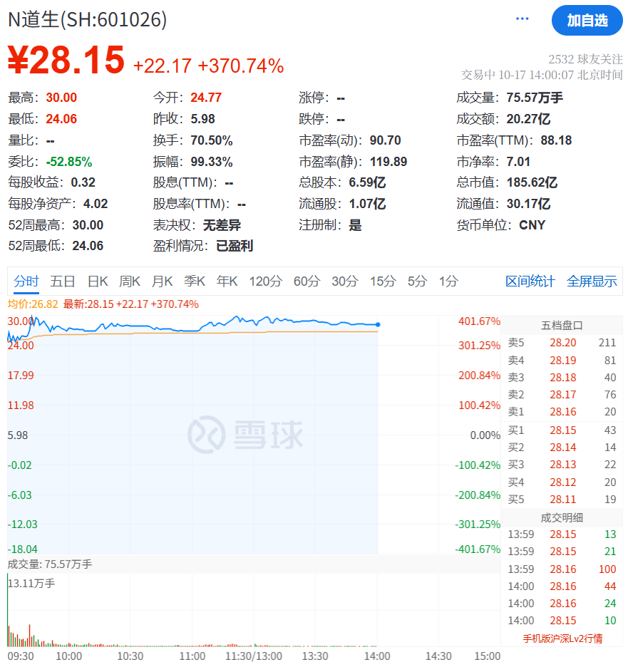 10月17日,新能源新材料龙头道生天合材料科技(上海)股份有限公司(以下简称“道生天合”)成功于上交所主板挂牌。上市首日,道生天合高开314%,盘中涨幅一度达到400%。截至下午14时,道生天合股价报28.15元/股,较发行价上涨370.74%,总市值185.62亿元。