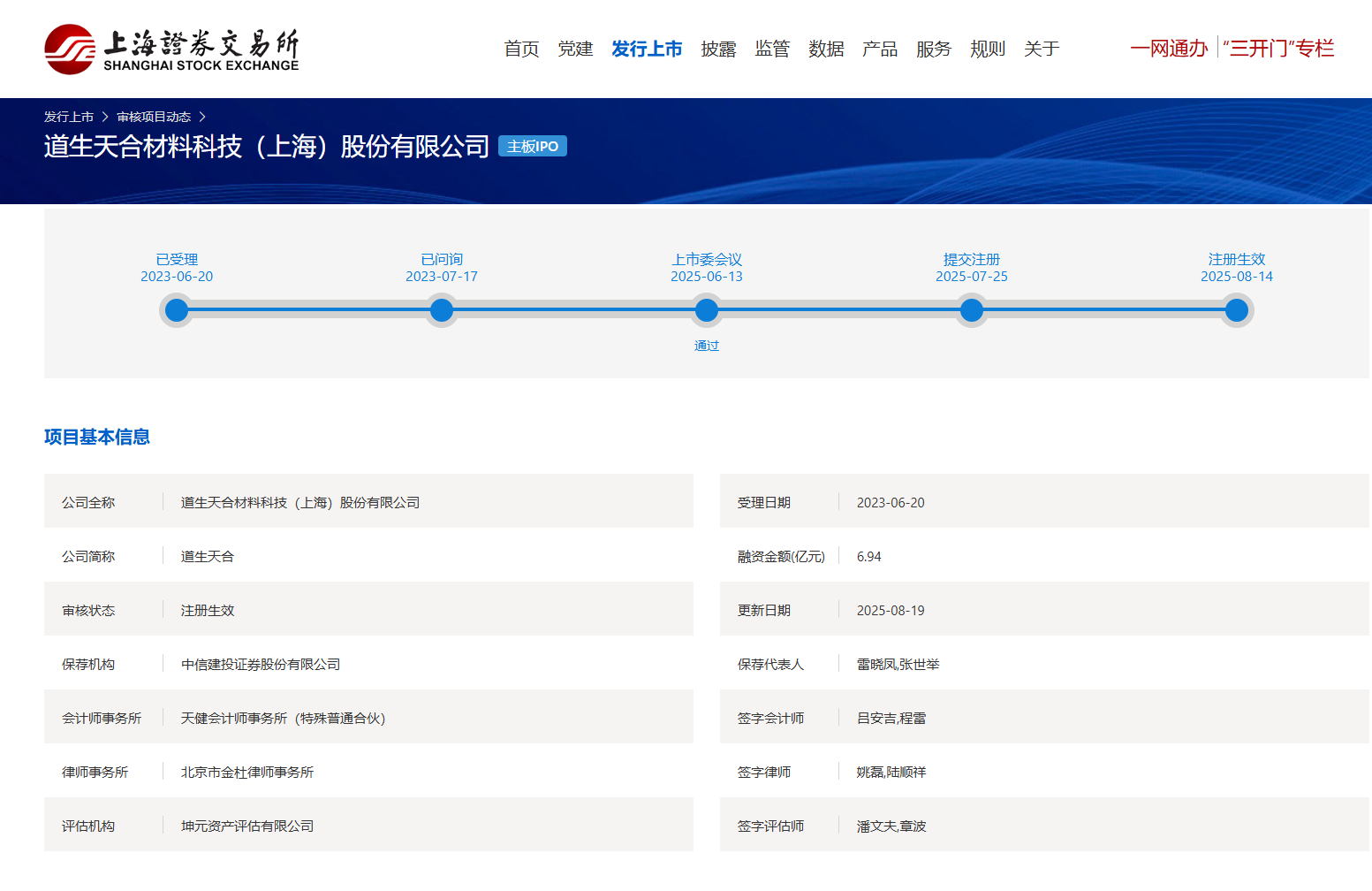 据悉,道生天合上交所主板IPO于2023年6月20日获受理,计划募资6.94亿元,此次IPO发行价格为 5.98 元/股,发行数量为13188万股,全部为新股发行,实际募集资金7.89亿元。