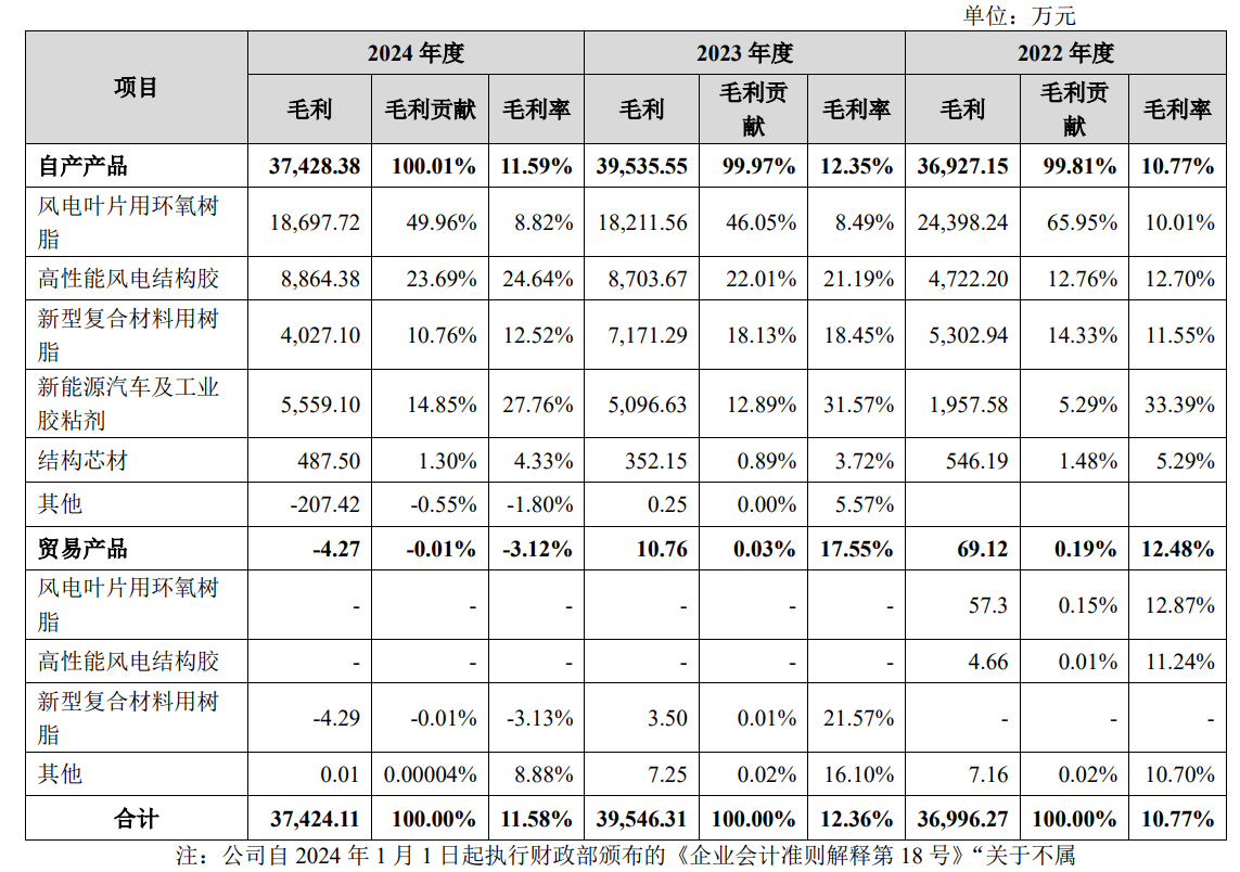 值得注意的是,2022年、2023年及2024年,道生天合风电叶片用环氧树脂产品的毛利率分别为10.01%、8.49%及8.82,呈现下降趋势。公司在招股书中表示,这主要系国内竞争者价格竞争加剧所致。