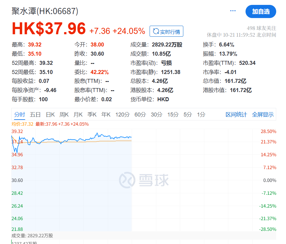 上市首日,聚水潭高开24.18%,截至午间休盘,聚水潭股价报37.96港元/股,较发行价上涨24.05%,总市值161.72亿港元。