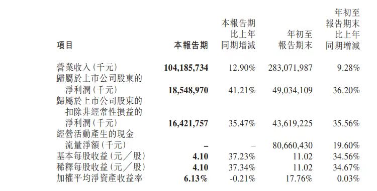 第三季度营收增长12.90%达1041.85亿元,净利润增长41.21%至185.49亿元,即便是扣非后,净利也来到了164.22亿元,同比增长35.47%。
