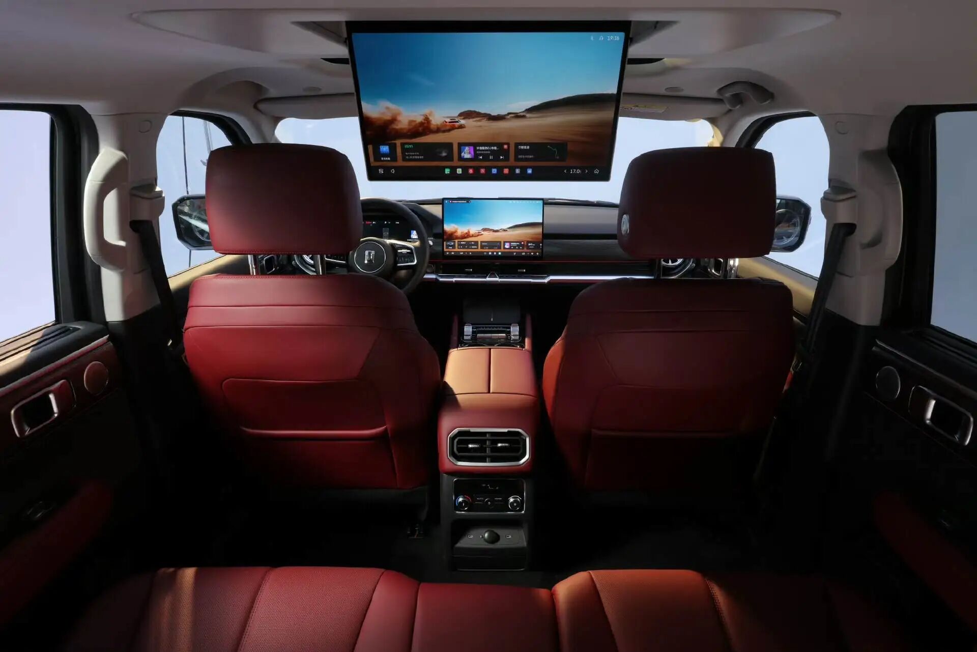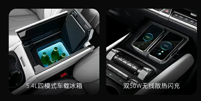 新能源的三件套也全给配齐了,不仅中央扶手里配备了一个5.4L的超大车载冰箱,支持-6度~50度自由调节,还给后排安排了一块15.6英寸的二排吸顶屏。