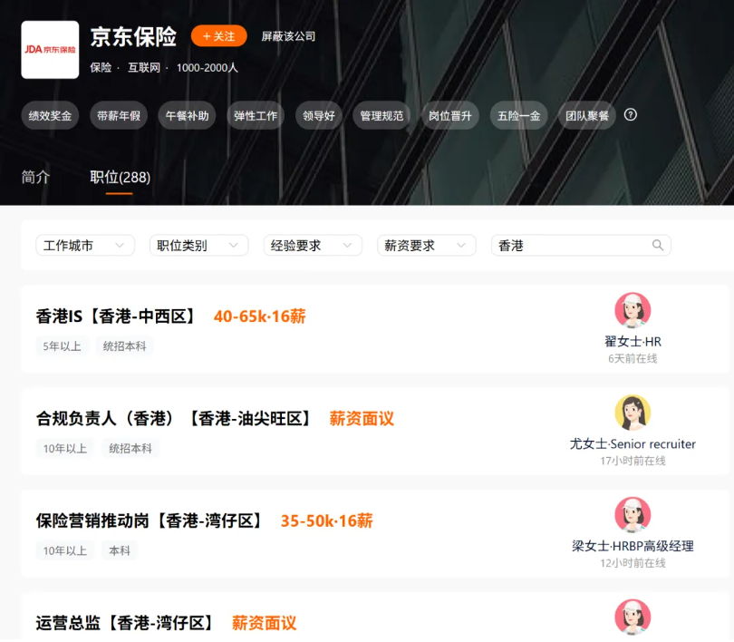 据明报财经内容显示,京东近月在多个内地及香港招聘平台上以“京东”“京东保险”“京东科技”等名义,招聘保险相关岗位。