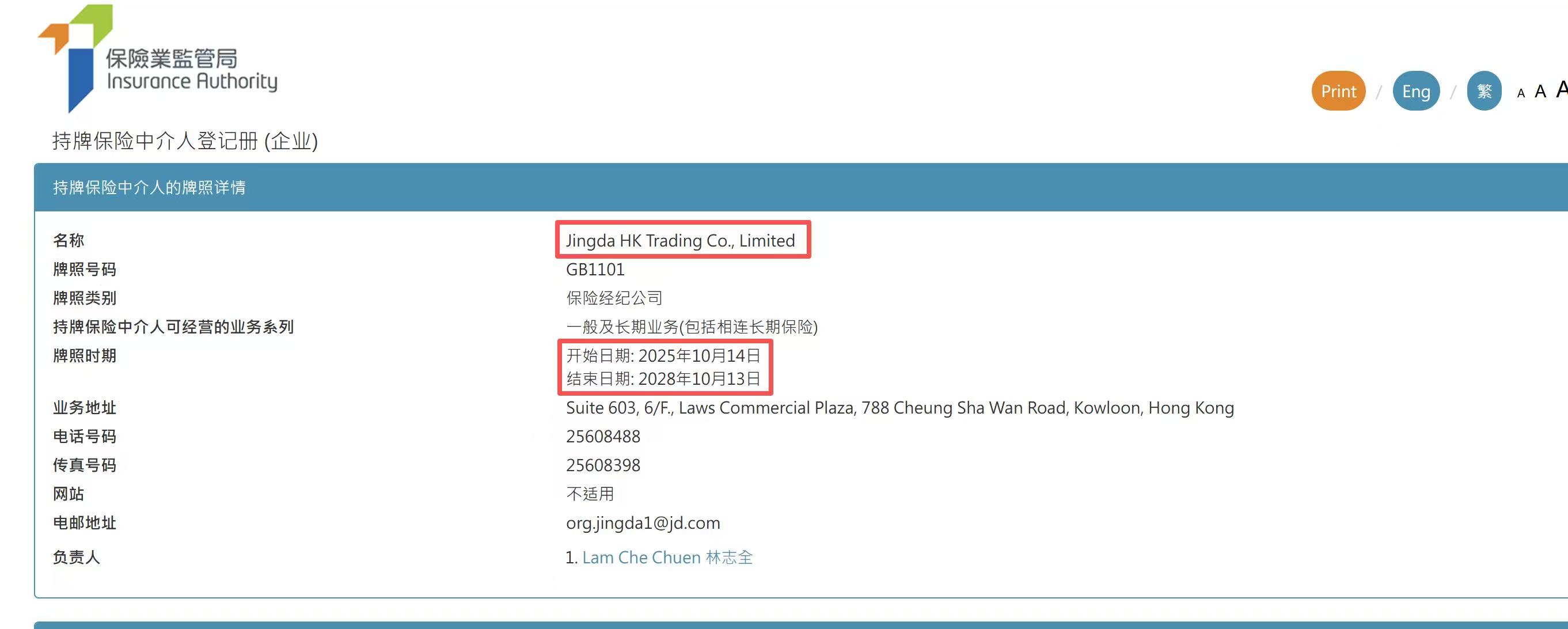 10月14日,据香港保险业监管局登记资料显示,一家名为Jingda HK Trading Co., Limited的公司正式拿到香港保险经纪牌照,可经营的业务为一般及长期业务(包括相连长期保险),有效期至2028年10月13日。