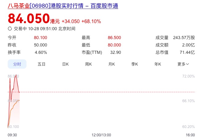 10月28日,八马茶业股份有限公司(简称:八马茶业)正式登陆港交所,发行价为50港元/股,开盘及高开为80.1港元/股,随后股价保持上涨态势,截至9:51分,八马茶业股价为84.05港元/股,较发行价上涨68.1%,市值71.44亿港元(约合65.35亿元)。