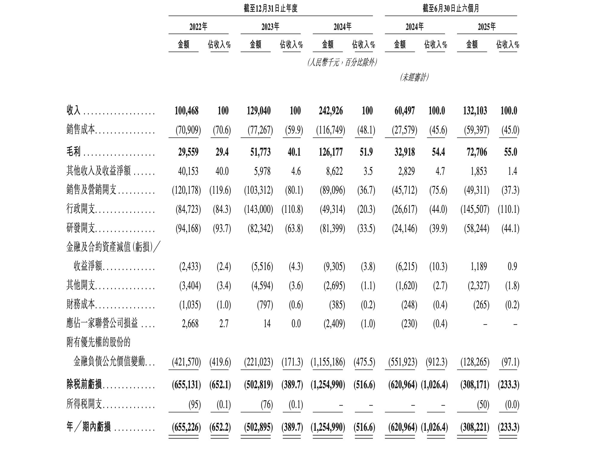 2022-2024年及今年上半年(下称:报告期),滴普科技的收入分别约为1.00亿、1.29亿、2.43亿、1.32亿元;毛利分别约为2955.9万、5177.3万、1.26亿、7270.6万元,毛利率分别为29.4%、40.1%、51.9%、55.0%。