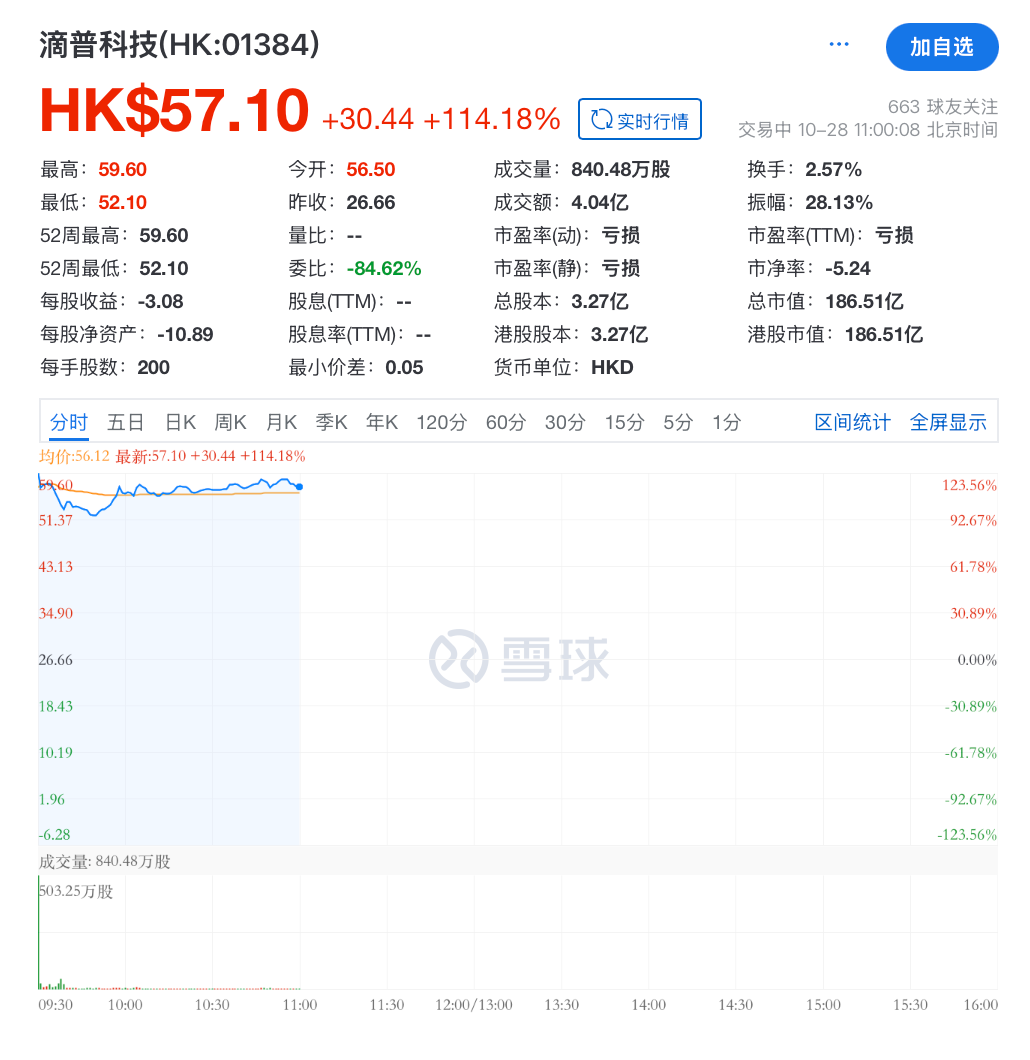 昨日暗盘交易中,滴普科技最高价达53.60港元,较发行价上涨99.73%。今日开盘,其股价大涨111.93%报56.50港元,总市值约184.55亿港元。截至发稿,滴普科技涨114.18%报57.10港元,总市值186.51亿港元。