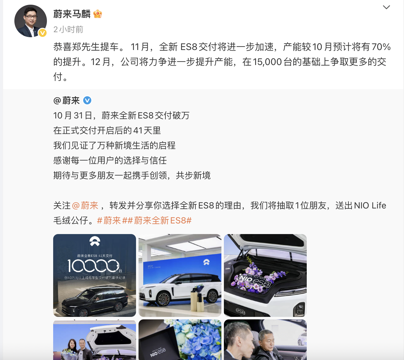 蔚来高管在微博上透露,11月,全新 ES8 交付将进一步加速,产能较10月预计将有70%的提升。12月,公司将力争进一步提升产能,在15000台的基础上争取更多的交付。