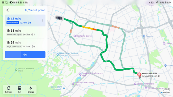和国内版本一样,AutoSDK国际版具备多路线规划能力,选择哪条路线可以自己决定,经过的红绿灯数量和总用时也会清楚的标明。