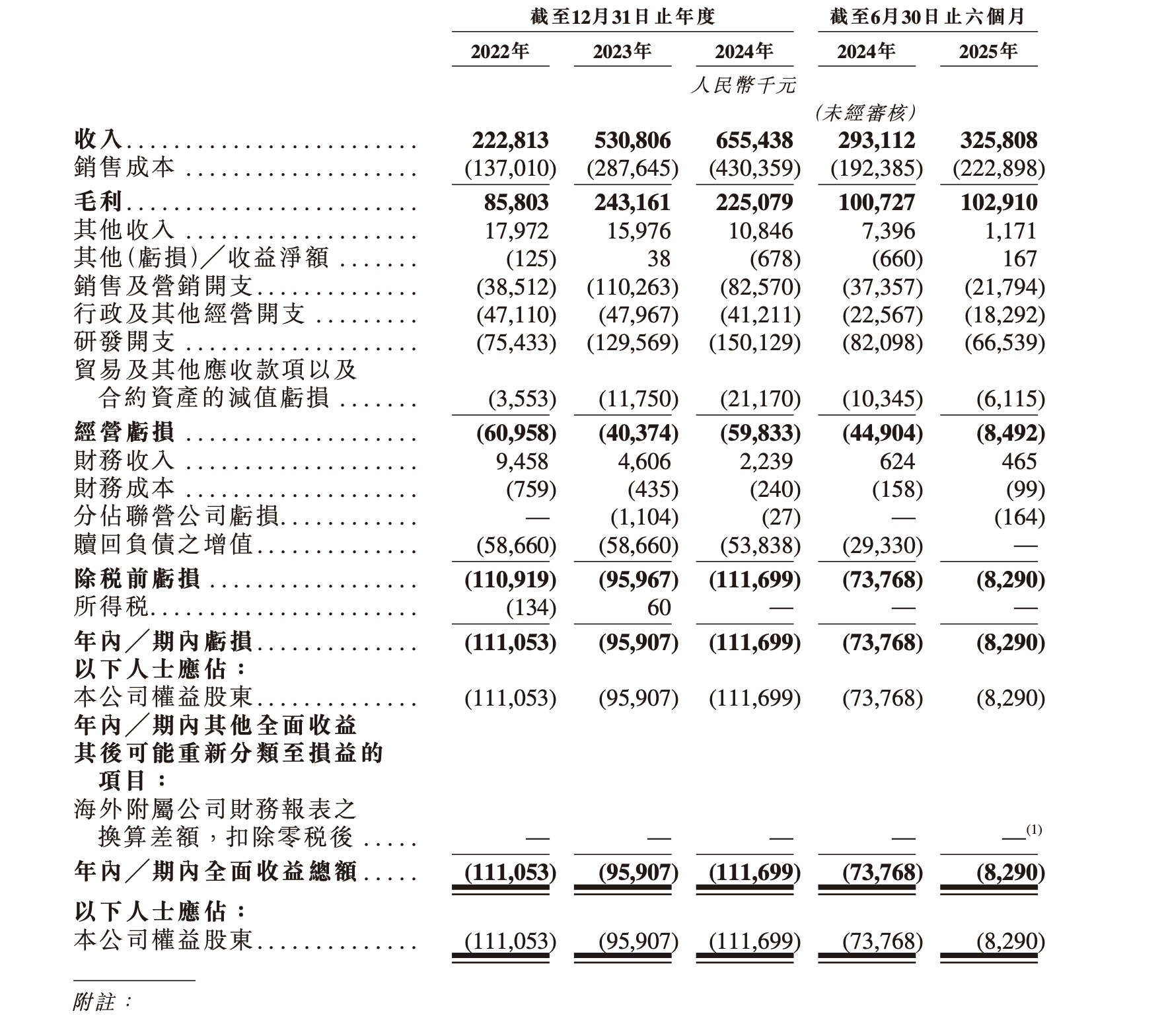 2022-2024年及今年上半年(下称:报告期),硅基智能的收入分别约2.23亿、5.31亿、6.55亿、3.26亿元;毛利分别约8580.3万、2.43亿、2.25亿、1.03亿元,毛利率分别为38.5%、45.8%、34.3%、31.6%;净亏损分别约1.11亿、9590.7万、1.12亿、829.0万元。