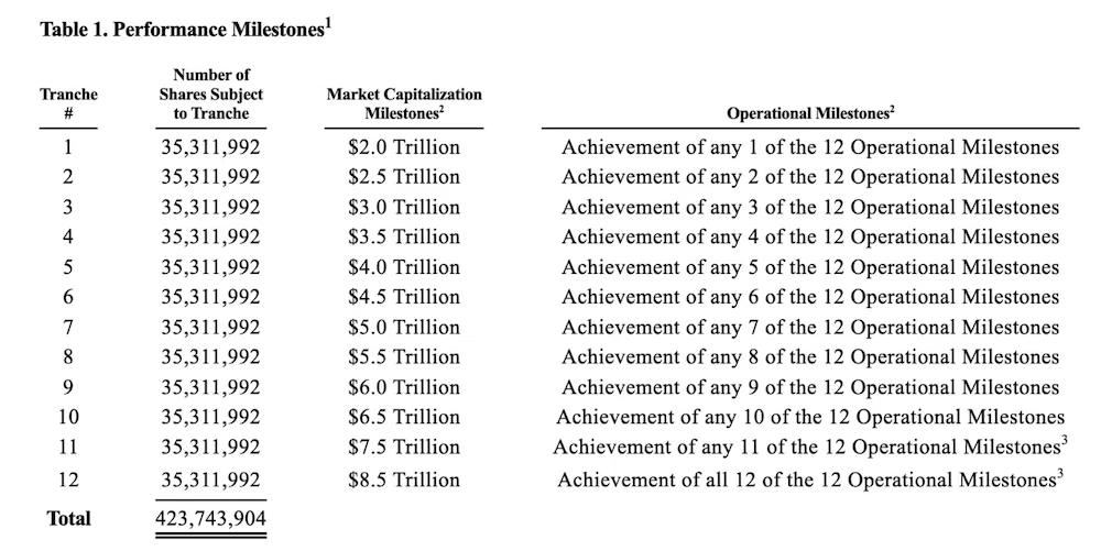 当然这是2035年的最终目标,初次目标是市值达到 2 万亿美元,接下来的 9 个阶段,每提升 5000 亿美元市值可解锁一部分,最后两个阶段则是需要提升 1 万亿美元,最终目标为 8.5 万亿美元市值。