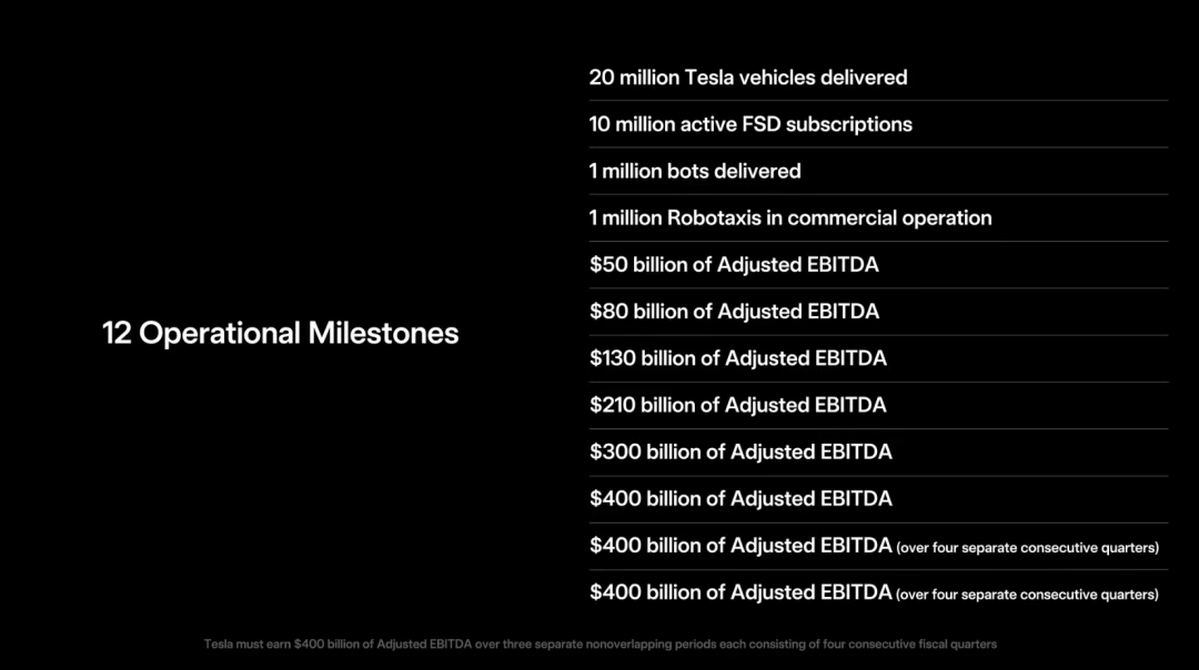 还有更苛刻的利润要求,得达成一系列调整后的 EBITDA(息税折旧摊销前利润)基准,最高需要达到4000亿美元(约2.85万亿元),这比2024年的利润提高将近24倍,最低一档也要达到500亿美元(约3564亿元)。