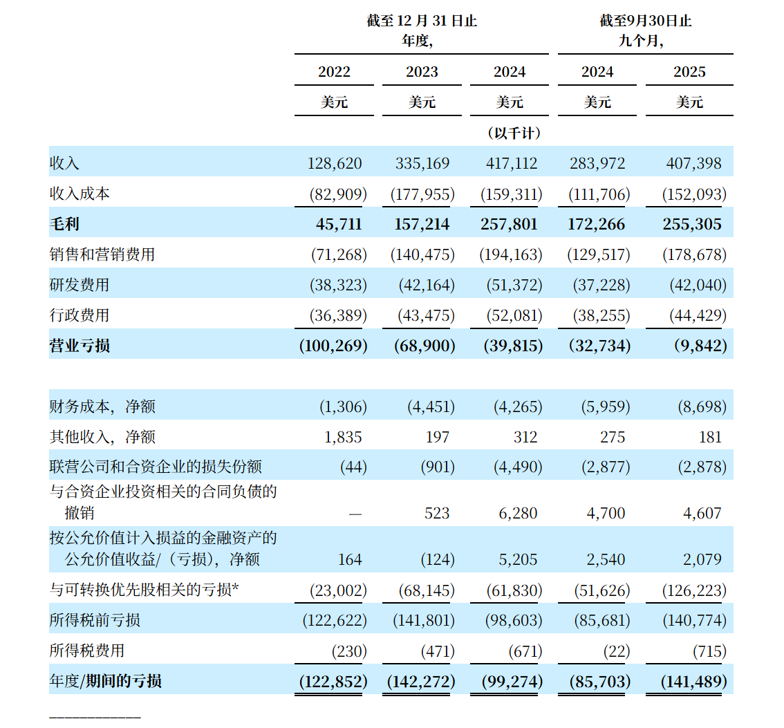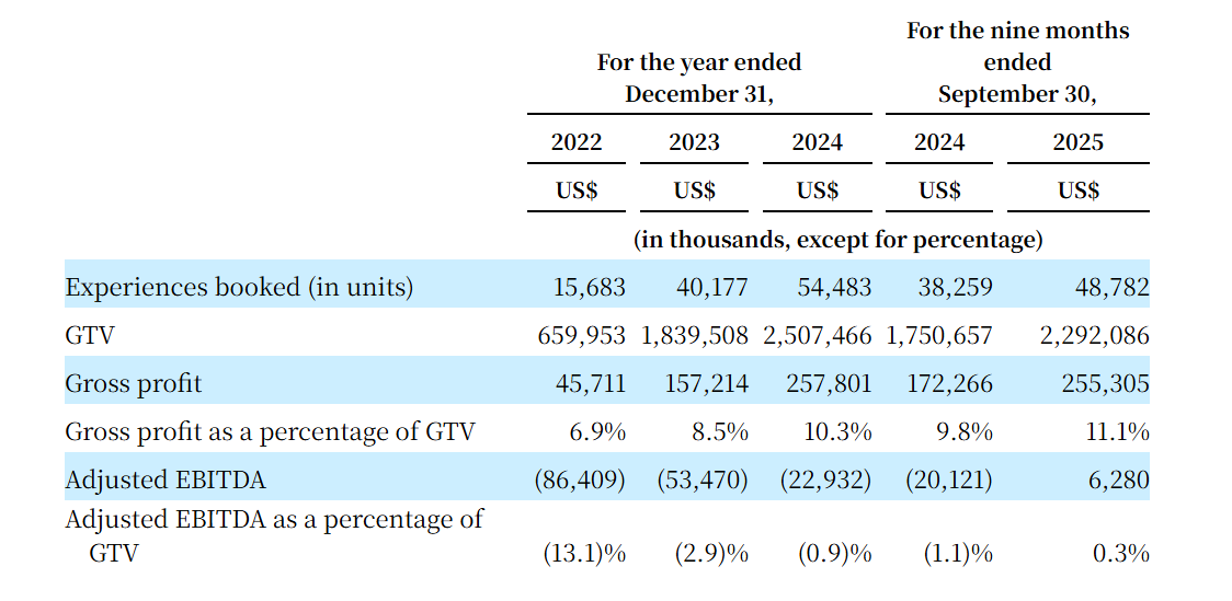 客路绝大部分收入来自通过平台提供的体验产品的销售,还有一些像合作方提供广告解决方案产生法广告收入。招股书显示,2022年、2023年、2024年及2025年前三季度,客路总营收分别为1.29亿美元、3.35亿美元、4.17亿美元及4.07亿美元;亏损分别为1.23亿美元、1.42亿美元、9927.4万美元及1.41亿美元。
