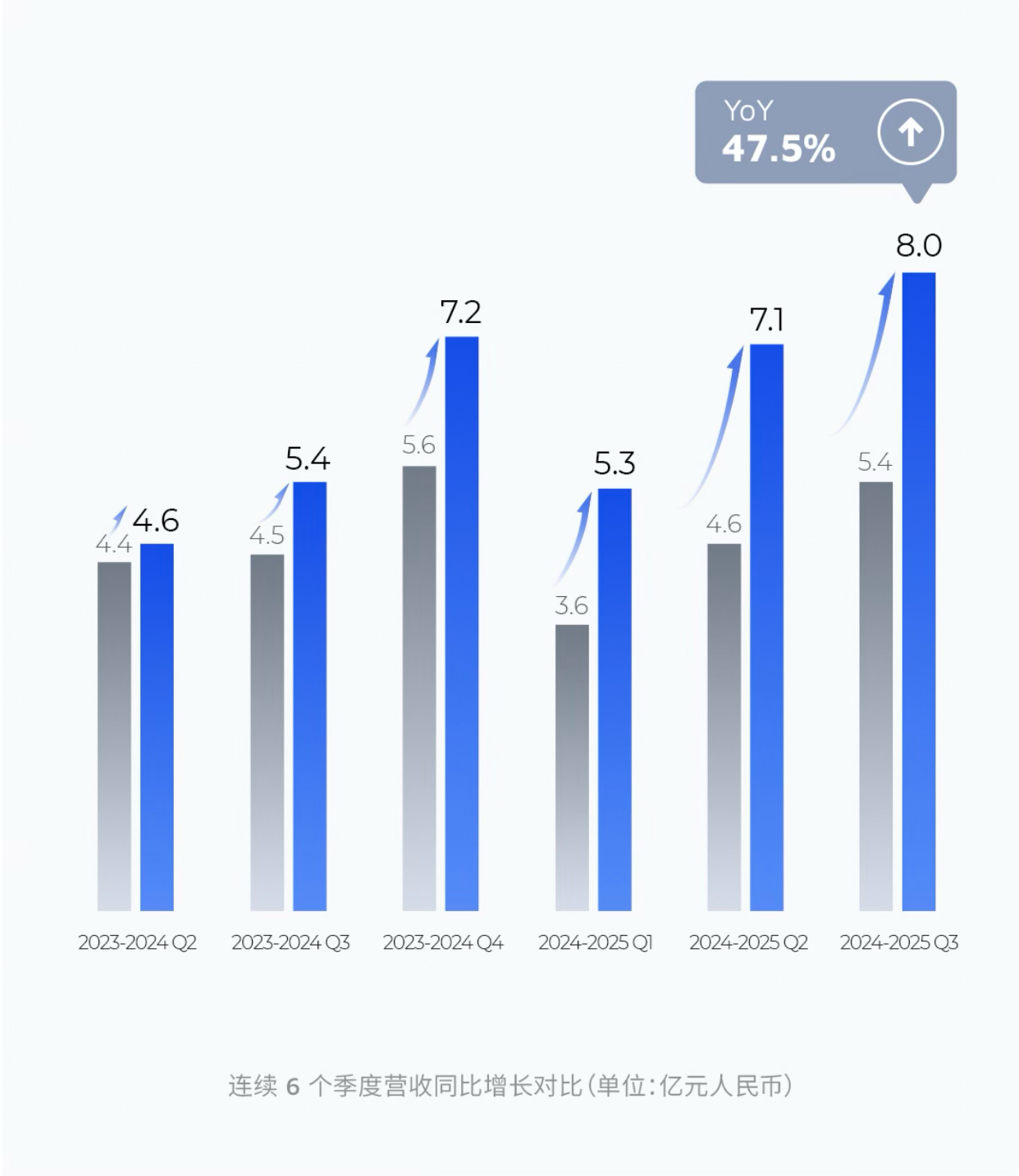 本季度,禾赛实现营收 8.0 亿元人民币,同比增长 47.5%,单季营收实现连续 6 个季度同比增长,稳居行业领先地位。