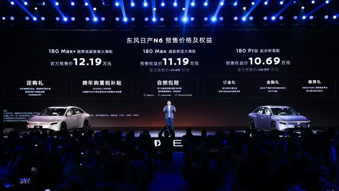 11月13日,日产首款插混轿车N6正式开启预售,限时10.69-12.19万元,并将在12月8日上市开启交付。