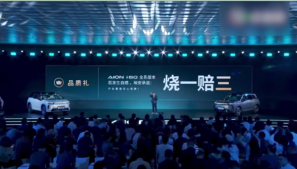 为了展示自己产品的安全性,埃安在现场公开承诺“烧一赔三”,如果自燃一辆,就赔你三辆,既是营销,也是一次对自身技术的极度自信。