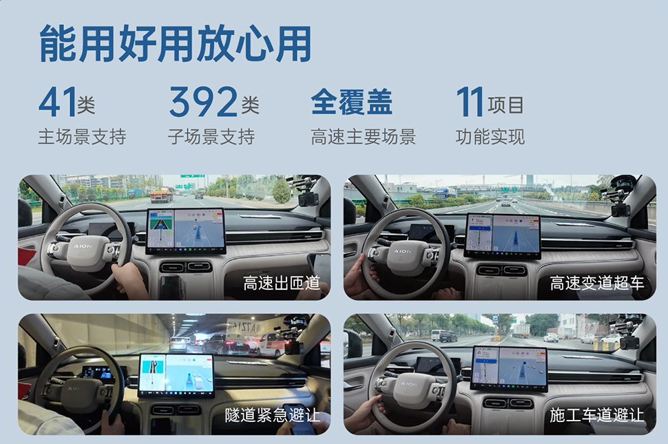 在功能覆盖上,系统支持41类主场景与392类子场景,尤其在高速场景实现全覆盖,上下匝道、变道超车等操作高效丝滑,高速NDA驾驶员接管次数1000公里少于1次。