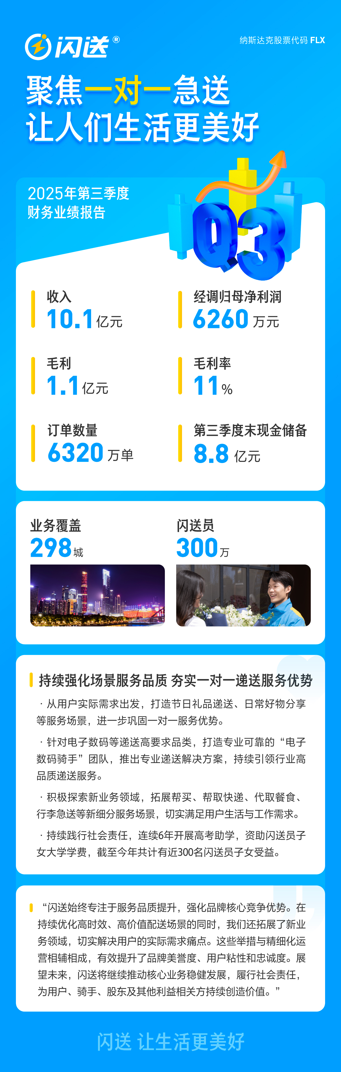 目前,闪送业务覆盖全国298个城市,三季度共完成订单6320万。在即时配送行业竞争加剧的背景下,闪送凭借“一对一急送”的差异化定位和精细化运营,展现出强劲的运营能力和增长韧性。