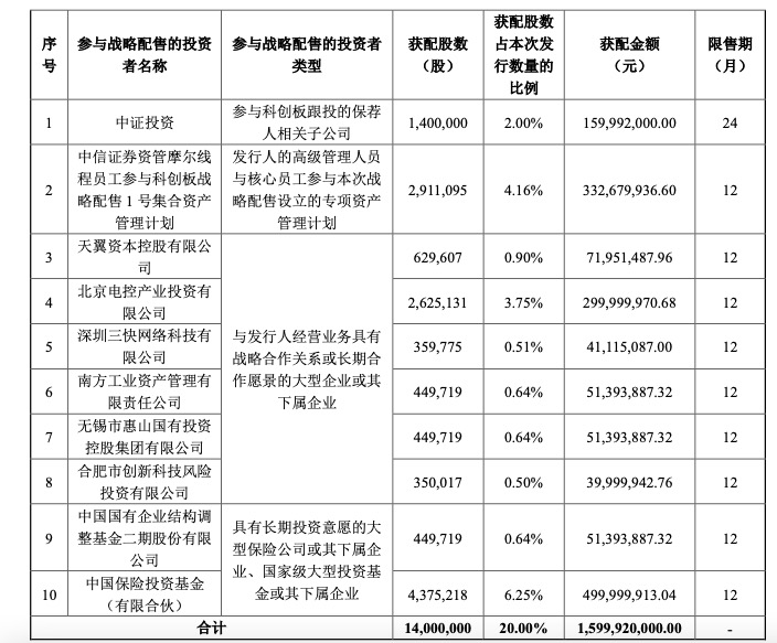 中证投资(参与科创板跟投的保荐人相关子公司)、天翼资本控股有限公司、北京电控产业投资有限公司、深圳三快网络科技有限公司(系美团旗下)、南方工业资产管理有限责任公司、无锡市惠山国有投资控股集团有限公司、合肥市创新科技风险投资有限公司、中国国有企业结构调整基金二期股份有限公司、中国保险投资基金(有限合伙)等获配,获配股数占此次发行数量的20%。