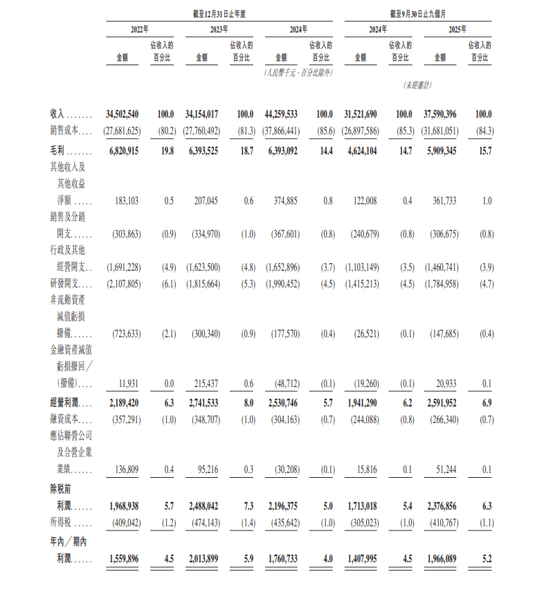 业绩方面,招股书显示,2022年、2023年、2024年及2025年前九个月,领益智造营收分别为345.03亿元、341.54亿元、442.60亿元及375.90亿元;毛利率分别为19.8%、18.7%、14.4%及15.7%;期内利润分别为15.60亿元、20.14亿元、17.61亿元及19.66亿元。