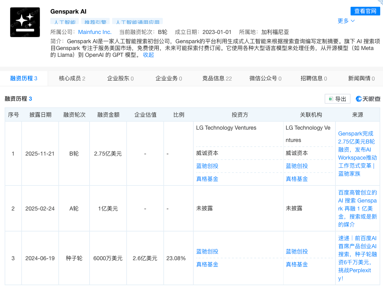 11月20日,位于美国加州帕洛阿尔托的AI搜索引擎Genspark(隶属于公司Mainfunc Inc.,下称:Genspark)完成2.75亿美元B轮融资,投后估值达12.5亿美元。