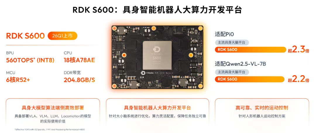 胡春旭:S600 的核心定义其实我们并不是说跟随哪个竞品,或者去对标什么的,我们更多是反向去思考,从人形机器人目前做端到端或者做大小脑的这种方式里面,它大概需要多大算力,需要什么样架构,然后反向来推导出这个芯片、套件,以及板卡的定义的,所以这是我们设计的一个核心逻辑。