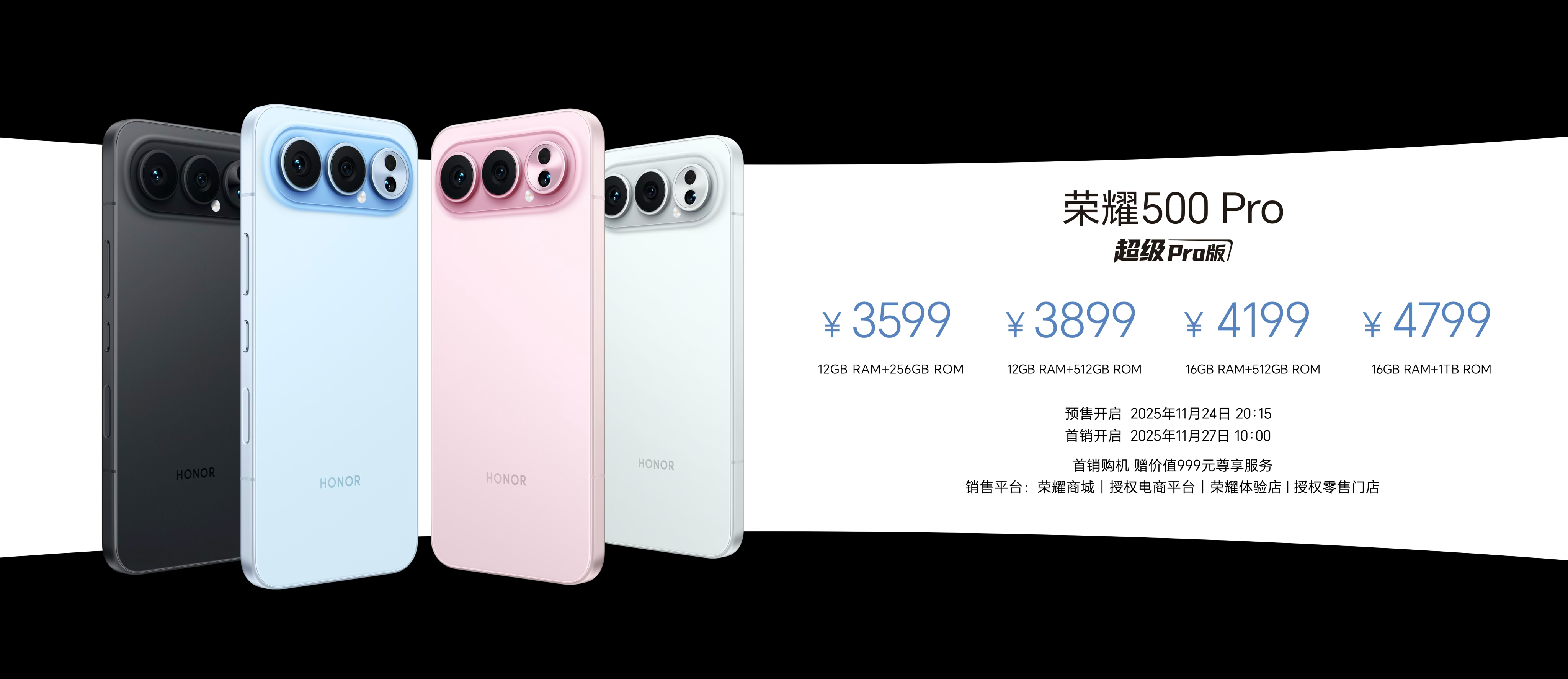 11月24日,荣耀500系列在杭州正式发布,该产品系列在“影像、性能、续航、外观、体验”等方面实现全维升级突破,重塑档位标准。荣耀500系列共两个版本,分别为荣耀500超级标准版与荣耀500超级Pro版,起售价分别为2699元、3599元,目前已经开启预售,11月27日10:00全渠道正式开售。