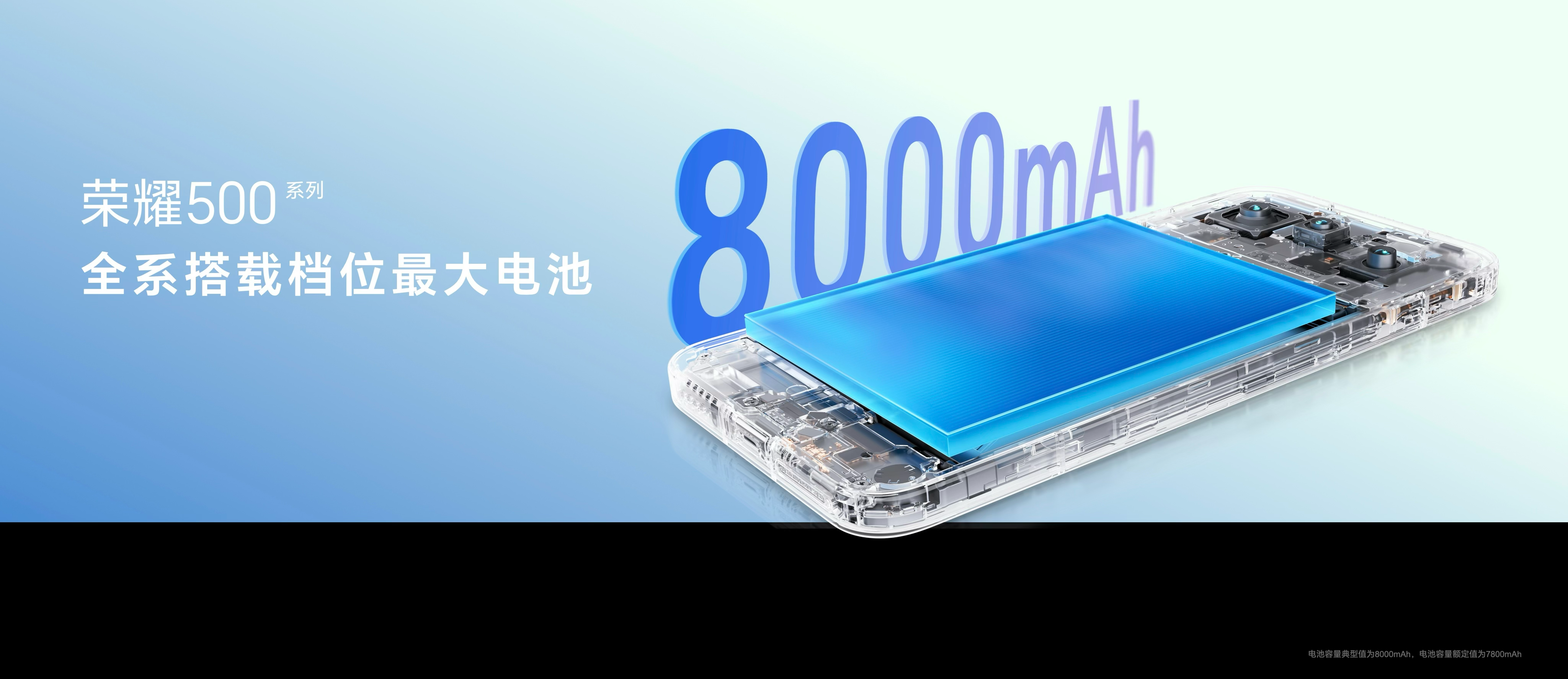 不仅性能拉满,荣耀500系列续航能力也全面升级,搭载8000mAh青海湖大电池,再度刷新档位手机电量纪录,成为档位唯一的“双八”规格产品,真正实现“性能与续航双双拉满”,荣耀500系列不做取舍,为用户提供一步到位的旗舰级体验。