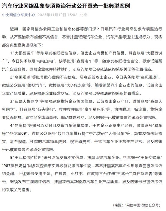此前,中央网络安全和信息化委员会办公室在《汽车行业网络乱象专项整治行动公开曝光一批典型案例》中明确指出,抖音账号 “王悟空说车”“987 疯狂奶爸” 因多次歪曲事实、诋毁新能源汽车性能、恶意抹黑汽车企业形象及声誉,已被依法依规依约关停。