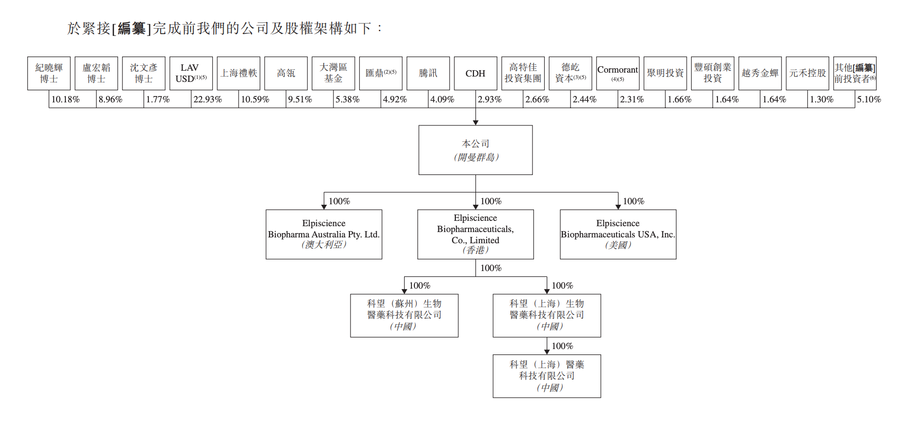 最新股权结构显示,纪晓辉博士持股10.18%,卢宏韬博士持股8.96%,礼来亚洲持股22.93%,高领投资持股9.51%,大湾区基金持股5.38%,汇鼎持股4.92%,腾讯持股4.09%,CDH持股2.93%,高特佳持股2.66%,德屹资本持股2.44%,Cormorant持股2.31%,聚明投资持股1.66%,丰硕持股1.64%,越秀持股1.64%,元禾持股1.30%。