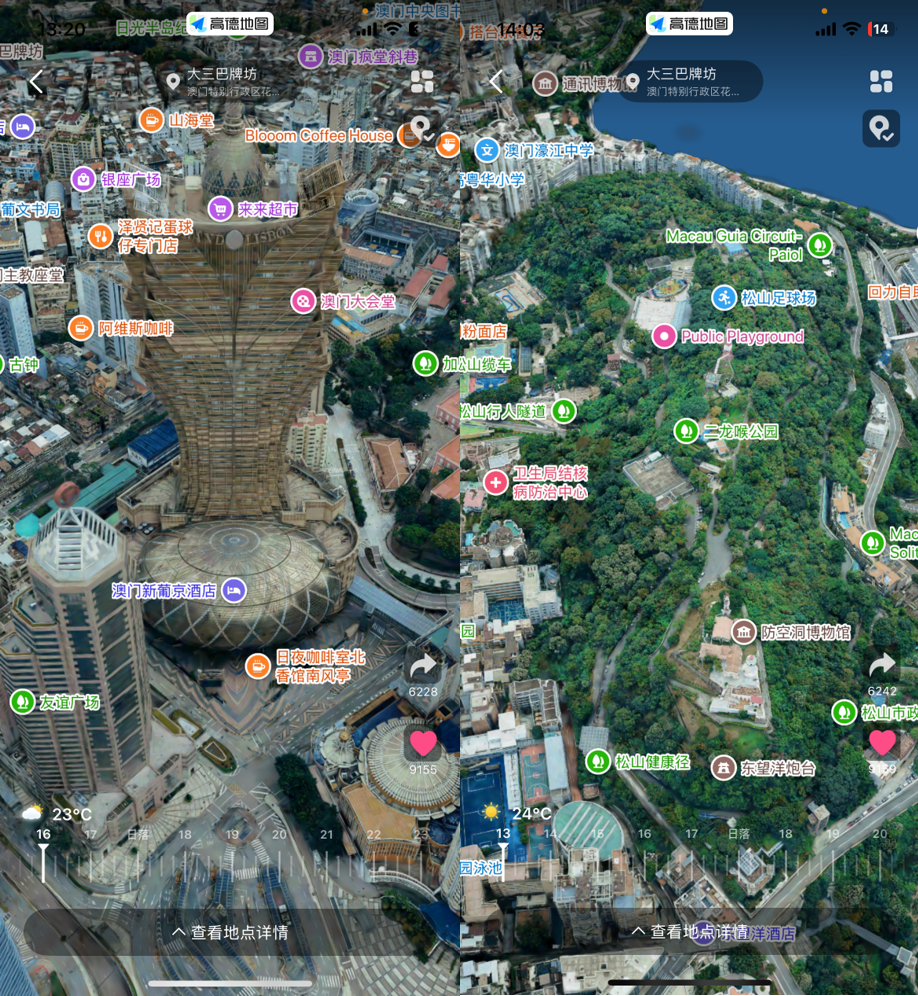 在出发前,游客可通过“一键智慧游澳门”中的奇境Max,在手机上以360度视角沉浸式鸟瞰澳门特区全貌。在空间智能技术的加持下,高德为澳门全域建立了生动逼真、美轮美奂的数字孪生模型。大三巴的古朴、澳门塔的开阔,酒店和官也街之间的距离远近,都可以在奇境Max中直观地看到,方便游客的出行和决策。