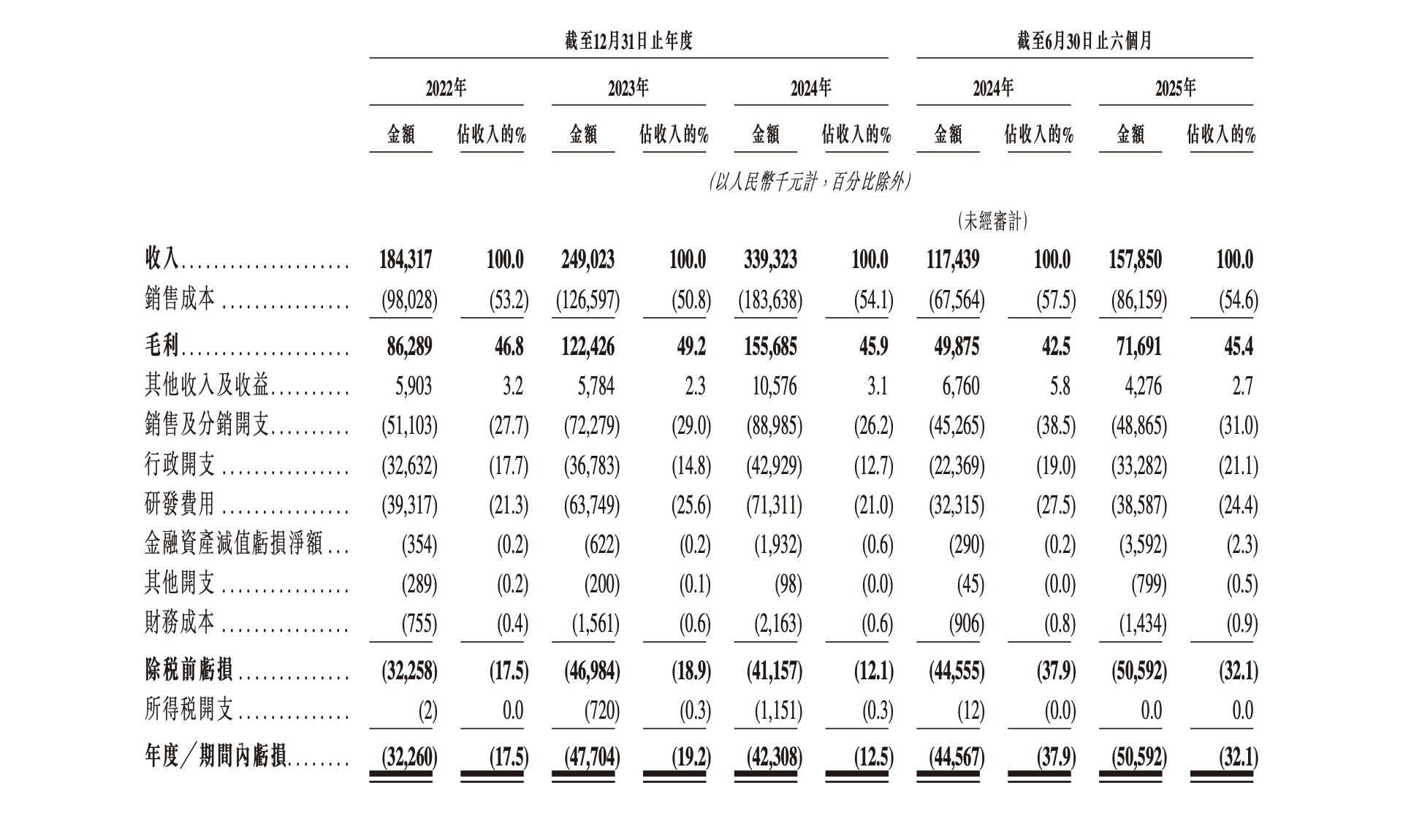 报告期内,仙工智能分别服务了380、587、832、630家客户;收入分别约1.84亿、2.49亿、3.39亿、1.58亿元;毛利分别约8628.9万、1.22亿、1.56亿、7169.1万元,毛利率分别为46.8%、49.2%、45.9%、45.4%;净亏损分别约3226.0万、4770.4万、4230.8万、5059.2万元;经调整净亏损分别约3074.8万、2090.7万、1063.1万、2197.5万元。