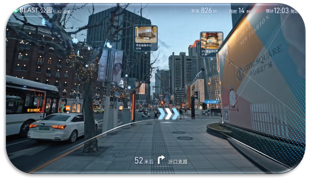 针对用户在复杂场景下的需求,高德解决方案提供差异化支持:在双手受限场景(如通勤高峰、陌生园区)和复杂环境(如夜间骑行、户外探险)中,智能手表可通过语音播报加震动提示实现无感交互;智能眼镜则以HUD信息投射保障视线不离路,离线地图、动态事件提醒等功能确保弱网环境下的可靠导航;“拍照识建筑”“个性化出行助手”等AI功能则显著提升了交互的智能度。