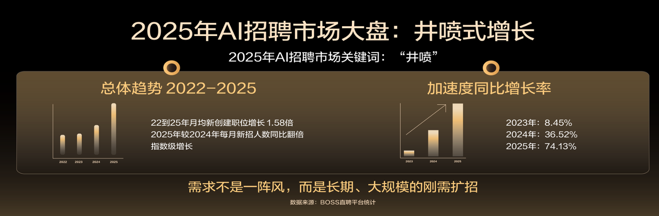 据介绍,BOSS直聘上AI相关岗位的月均新发职位数同比增速呈现出明显的上扬曲线。2023年为8.5%,2024年为36.5%,2025年则达到74.1%。