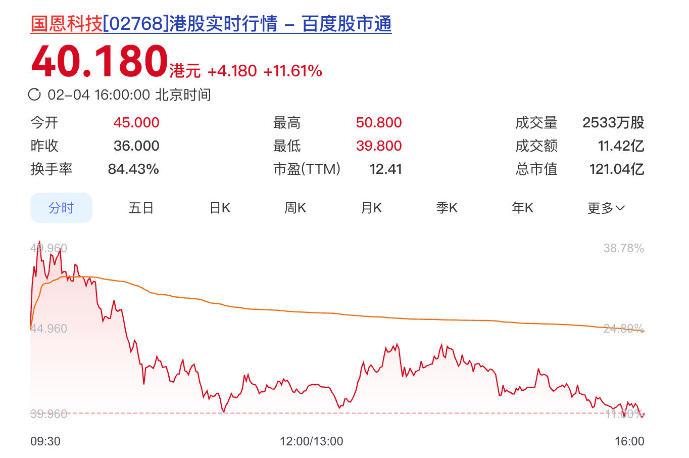 2月4日,青岛国恩科技股份有限公司(简称国恩科技)正式在港交所挂牌上市,招商证券国际为独家保荐人。发行价36港元/股,开盘报45港元,涨25%,总市值约135亿港元。截至当日收盘,每股涨11.62%至40.18港元,总市值为121.04亿。