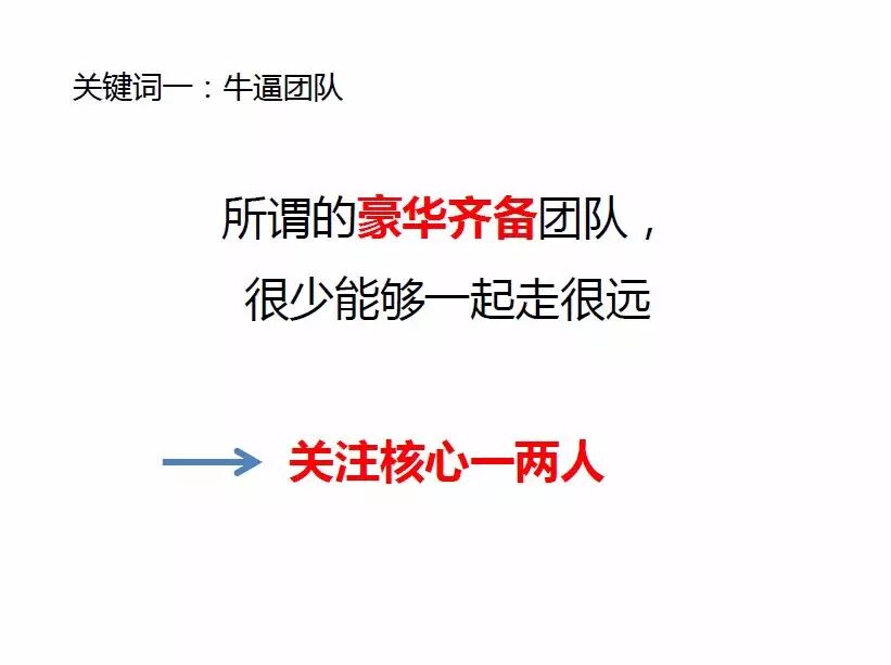 所谓的牛逼团队,现在很多创业者比投资人对投资的事还要懂,他都知道投资人就看的是团队,一般创业的时候搭建一个特别牛逼的团队,现在总结看,初期搭建越完整越豪华的团队走到最后散的特别多。所谓的豪华齐备的团队走的很远的很少。现在搞这个项目团建的时候,所谓的O都有了以后这样的团队比较可怕,创业的过程未来有很多未知的,走着走着需要的能力不一样了,有的岗位被占了,优秀的人还进不来。不要太强调所谓的这种太齐备的团队,最终要关注到具体某一两个核心的人,很多时候是一个人,两个人,这两个人是灵魂。大家来做项目的时候,基本上观点放在一两个人上面,看这个团队全部人都走了,看他还能不能带出一个牛的团队。对创业者来讲不用怕团队的迭代,中间有一定的变动都没有关系,看看你自己的一把手是不是有能力找到更合适的人,这个是对过去那么多项目的回顾里面发现的一个现象。