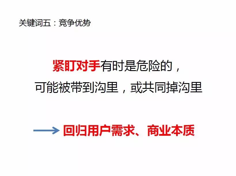 现在好多创业者非常注重竞争,看重竞争优势,我们有什么优势,一方面很看重竞争,这是好处,强调我们是有优势。现在会发现紧盯对手有时会很危险,在于大家都是初创的阶段,对手对不对还不知道,我们投过这个项目,特别有意思,他们做产品改版,有一个功能加上去有个新产品一发布,就发现这里面有问题,我们正打算下来的时候,发现竞争对手加上去了,他们根本不知道是一个失败的案例。包括创业咖啡,有很多是未来创业来做的,也有可能觉得开创业咖啡是不是很赚钱,后来发现领头这几家说我做咖啡是很不赚钱的,这就发现很悲剧。对对手的看法要淡然一点,在现在创业很热的情况下,大家往往用了一种方法叫比较法,前面有几个在那跑,我就跟着跑,阿甘正传,阿甘在路上跑,就有一堆人跟着他跑,跑到累了阿甘要走了,所有人就不知道怎么办了。呼吁大家无论投资还是创业,还是回到对用户需求和商业本质上来,只要心静得下来,创业的事情才有很大成功的机率。