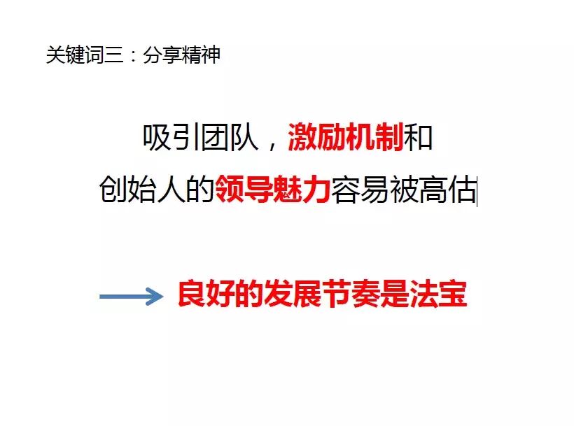 所谓的分享精神,团队里面很重要的是创始人有能力能够把一支队伍带好,团结好走到最后,这个队伍才能成功。现在的项目都有很多的学习,一上来有很多的激励机制,包括CEO怎么去分享这个东西,很多人学的还是不错的。经过这几年还是会出现很多的问题,不管你刚开始有多么严密激励的制度跟心胸,好多团队人员该走还是走了,跟发展的速度有关。比如说投完以后项目没有什么进展,所谓的核心团队里一两个人就要走了,两年左右的时间还没有什么进展,可能一半以上的团队就走了,三四年可能就剩下一个光杆司令。创业是很大压力的,有心胸有什么也好,发展是硬道理。现在强调很多东西要保持良好的节奏,节奏不用太快也不用太慢。现在是小步快跑,过去的一两年也观察了很多,融资节奏是比较快的,不一定特别大,但是要保持良好的节奏,有了发展的速度才有可能辅助你把创业的项目进展下去,团队才能够稳定,才有长远发展的基础。